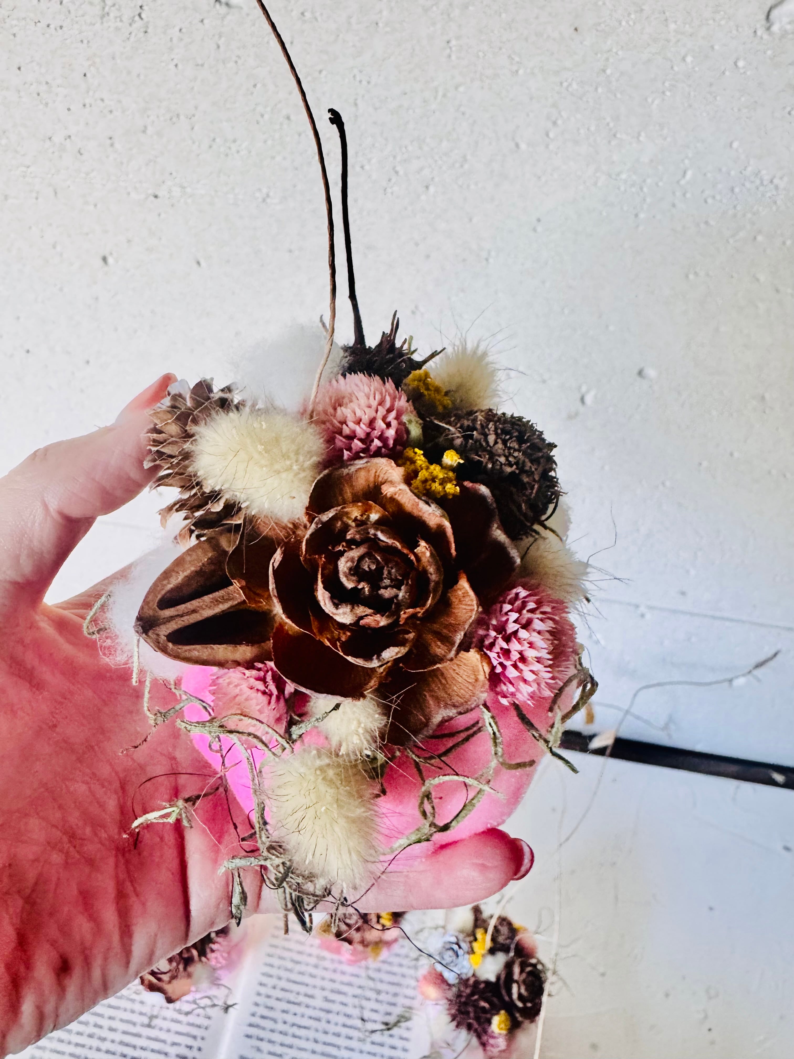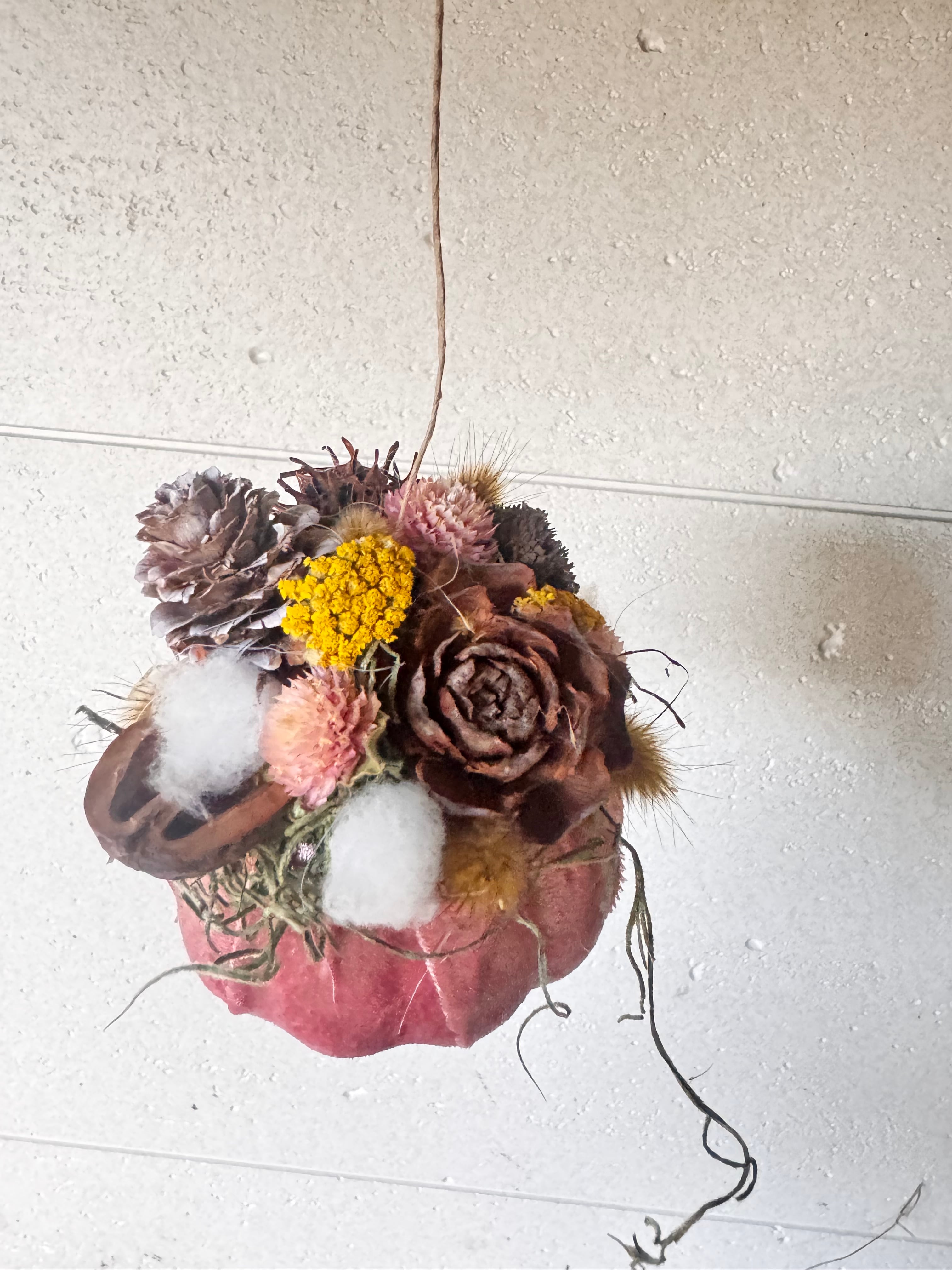 木の実やドライフラワーをたっぷりとあしらった、秋らしいパンプキン型のオーナメントです。